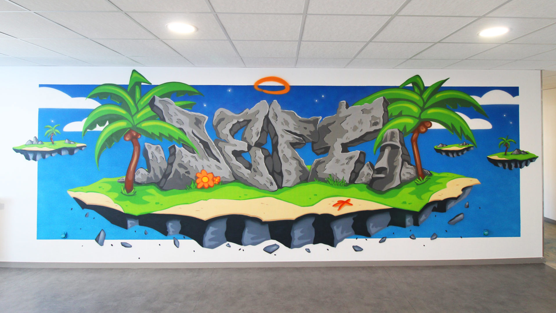 Fresque réalisée dans le nouveau bâtiment des Docks de Blois à Vichy. Projet réalisé avec Repy, Waro, Beame et Binok dans les espaces communs de la nouvelle résidence intergénérationnelle. Le nouveau bâtiment a été construit sur un ancien spot de graffiti : Radar.